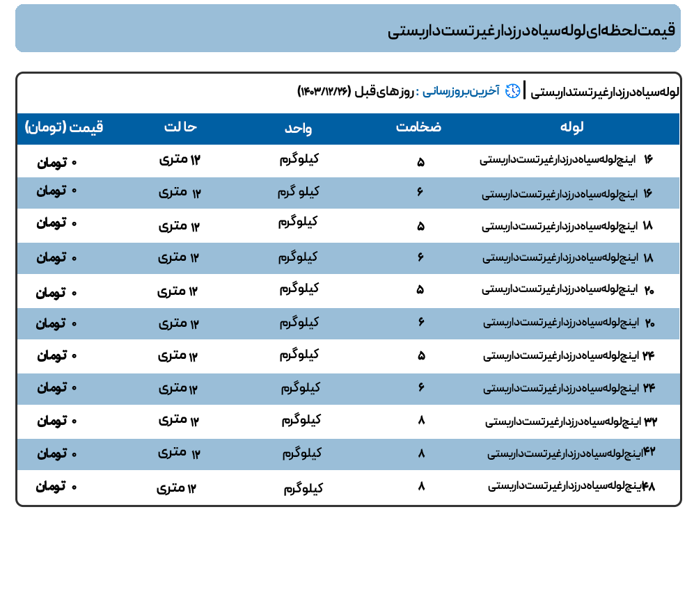 لوله سیاه درزدار غیر تست (داربستی) نوعی لوله فولادی جوشکاری‌شده است که برای کاربردهای غیرفشار، مانند ساخت داربست‌های فلزی، سازه‌های موقت و صنایع سبک استفاده می‌شود. این لوله‌ها برخلاف انواع تست‌شده، تحت آزمایش‌های فشار قرار نمی‌گیرند و بیشتر بر اساس استحکام مکانیکی و کاربری در سازه‌های غیرحساس تولید می‌شوند. لوله‌های داربستی به دلیل وزن مناسب، قابلیت جوشکاری و قیمت اقتصادی، در پروژه‌های ساختمانی پرکاربرد هستند.